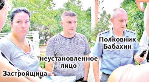 Полковник Бабахин, и.о. начальника УВД города, внес порядок в весь наш тарарам. Ведь галдели все, истомленные многочасовой вахтой. Когда чуть поутихли, Александр Бабахин представился по полной форме, внимательно всех выслушал, несмотря на то, что неустановленное лицо (на фото рядом с Бабахиными) перебивал всех жителей. Но полковник разрулил ситуацию. А для этого предложил поехать представителям обеих сторон в милицию и там разобраться. Оригиналы документов на стройку изъять и провести проверку их подлинности. А до выяснения этого обстоятельства стройку прекратить.
