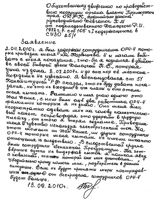 Напоминаю, что в Ваш адрес 17 августа 2010 года поступило заявление от президиума ОДПК «Хранители закона» с предложением выделить представителя прокуратуры для оперативной проверки совместно с представителями общественности заявления граждан о наличии камеры пыток в одном из подразделений милиции Приморского края и применении пыток к задержанным с целью получения нужных, подчеркиваю нужных, а не правдивых показаний.
