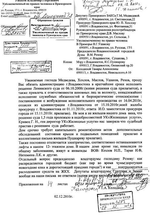 Это она подала в суд на администрацию города Владивостока с требованием провести капитальный ремонт нашего дома и выиграла. А теперь борется с судебными приставами за выполнение решения суда. Это она, больная, зорко следила за ремонтом отмостки дома и асфальтного покрытия во дворе дома и не подписывала акт приема передачи плохо выполненных работ. Это она активно участвует на собраниях жильцов дома и дает дельные предложения. Если бы побольше таких, как наша Тамара Алексеевна, с активной жизненной позицией, глядишь, и жизнь бы в стране наладилась.