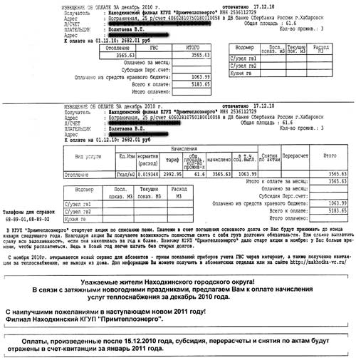По данным пенсионного фонда, сегодня в Находке проживает около 41 тысячи пенсионеров (это не считая пенсионеров ведомственных, отработавших судьями, прокурорскими и т.п. – они получают пенсию в своих ведомствах). Размер средней пенсии по Находке – восемь тысяч рублей. Как выживают наши старики, когда только в квитанциях «Примтеплоэнерго» на оплату отопления за декабрь 2010 года стоит сумма 3 тысячи 565 рублей 63 копейки за 61,6 м2 площади жилья (а еще надо оплатить воду, свет, вывоз мусора, cоциальный найм жилья, обслуживание мест общего пользования и текущий ремонт, телефон, купить самые необходимые лекарства и при том что-то оставить на хлеб насущный) – уму непостижимо!