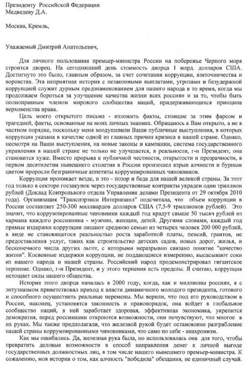 Автор обращения призывает президента продемонстрировать россиянам, что антикоррупционное законодательство распространяется на всех, в том числе и на премьер-министра. Письмо было размещено на сайте Corruptionfreerussia.com на русском и английском языках.