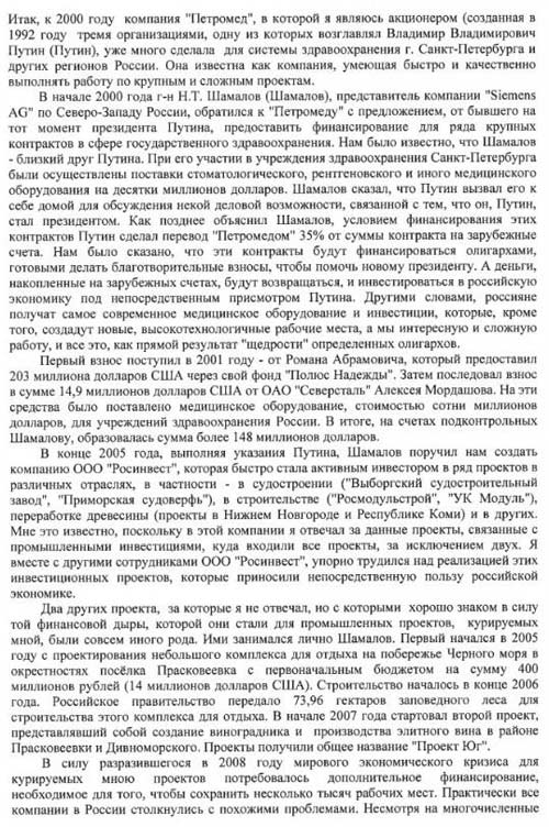 «Шамалов сказал, что Путин вызвал его к себе домой для обсуждения некой деловой возможности, связанной с тем, что он, Путин, стал президентом, – пишет Колесников. – Как позднее объяснил Шамалов, условием финансирования этих контрактов Путин сделал перевод «Петромедом» 35% от суммы контрактов на зарубежные счета. Нам было сказано, что эти контракты будут финансироваться олигархами, готовыми делать благотворительные взносы, чтобы помочь новому президенту. А деньги, накопленные на зарубежных счетах, будут возвращаться и инвестироваться в российскую экономику под непосредственным присмотром Путина».