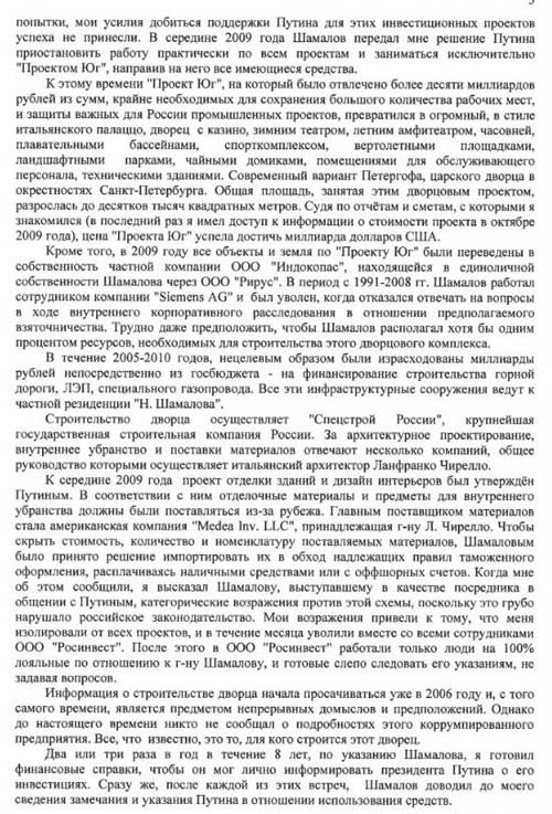 «К этому времени «Проект Юг», на который было отвлечено более десяти миллиардов рублей из сумм, крайне необходимых для сохранения большого количества рабочих мест и защиты важных для России промышленных проектов, превратился в огромный, в стиле итальянского палаццо, дворец с казино, зимним театром, летним амфитеатром, часовней, плавательными бассейнами, спорткомплексами, вертолетными площадками, ландшафтными парками, чайными домиками, помещениями для обслуживающего персонала, техническими зданиями. Современный вариант Петергофа, царского дворца в окрестностях Санкт-Петербурга», – говорится в письме.
