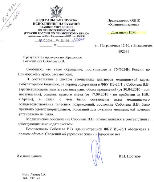 Также в своем письме мы НЕ УТВЕРЖДАЛИ, что именно к гр. Гайдамаку и Маргалику применялись пытки. Мы написали о том, что к нам в массовом количестве начали поступать жалобы о применении пыток к задержанным, но ПРОКУРАТУРА ПРИМОРСКОГО КРАЯ УКЛОНЯЕТСЯ ОТ СОВМЕСТНОЙ С ПРЕДСТАВИТЕЛЯМИ ОБЩЕСТВЕННОСТИ проверки по данным заявлениям.