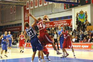 Стартовую десятиминутку спартаковцы закончили со счетом 22:20 благодаря броску Евгения Бабурина на последней секунде с центра площадки.