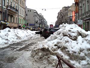 Правда, в последнее время, после того как принят местный закон об ужесточении штрафов за ненадлежащую уборку вверенной территории (весь Питер разбили на зоны и участки по ответственным) во дворах уборка стала заметна – ездят бульдозеры, сгребают снег на обочины и на палисадники, там, где они есть.