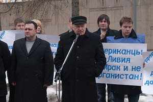 Напоследок во время пикета были процитированы слова одного из экспертов в области международной политики: «Несомненно, что Запад заинтересован в падении режима Каддафи. В Бахрейне власти танками разгоняют МИРНУЮ демонстрацию – мировое сообщество помалкивает. А в Ливии правящий режим подавляет ВООРУЖЕННЫЙ мятеж, и его на этом основании объявляют преступным. Всё дело в том, что полумарионеточный режим Бахрейна полностью устраивает Вашингтон (там расположена крупнейшая на Ближнем Востоке американская военная база), а вот Каддафи для америкосов – матерый вражина. Мало того, что он выгнал из Ливии американские и британские войска, которые при короле Идрисе имели там свои базы, так еще, самое возмутительное, 40 лет не дает западным корпорациям грабить природные богатства страны. Вот это и есть тот самый субъективный, но решающий фактор, определяющий, в какой стране мира произойдет очередная цветная или кровавая революция».