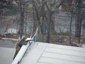 Ну и видит: бегают по крышам госпитальных сооружений какие-то с автоматами и – тр-р-р!