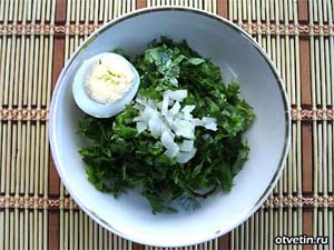 На пучок молодых листьев подорожника – пучок молодых листьев крапивы, небольшая луковица, 2 ст. л. тертого хрена, 1 крутое яйцо, сметана, соль, сахар – по вкусу.