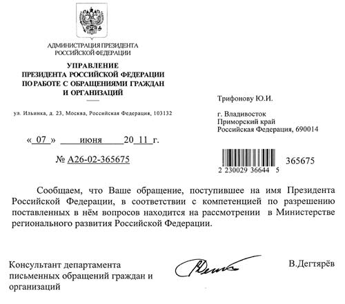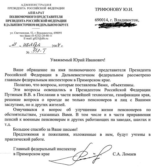 ОБРАЩЕНИЕ ВЕТЕРАНА К РУКОВОДСТВУ РОССИИ И ОТВЕТНЫЕ ОТПИСКИ.