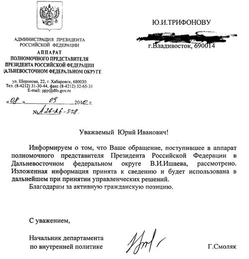 Ваше поручение своему полпреду по ДВФО г-ну Ишаеву В.И. и губернаторам ДВ представить мероприятия по депопуляции, децивилизации, привлечению и закреплению населения на Северах, Островах и Дальнем Востоке побудило меня внести свои наболевшие предложения.