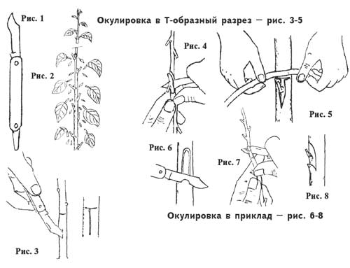 При окулировке вприклад на подвое движением ножа сверху вниз срезают полоску коры с древесиной. При этом лезвие ножа постепенно заглубляют больше и больше. Длина полоски 2,5-3 см. Далее лезвие ножа ставят на 3-4 мм выше нижнего конца надреза под углом 45° и заглубляют лезвие в кору и древесину так, чтобы перерезать отделенную полоску коры с древесиной. Если ее удалить, то на подвое в конце среза заметно клинообразное углубление (рис. 6). Место для щитка готово. Теперь срезают щиток с почкой. Черенок берут в левую руку, но вершиной от себя. Ближе к себе от выбранной почки на 1-1,5 см ставят нож под углом 45° и заглубляют лезвие в древесину, к себе. Вынимают лезвие из разреза и над почкой (дальше от себя) ставят лезвие почти параллельно. Углубляясь в древесину, движутся к почке и далее до пересечения с поперечным надрезом (рис. 7). Щиток окажется на лезвии ножа, а конец щитка будет иметь форму клина. Щиток вставляют в углубление среза на подвое так, чтобы произошло их полное совмещение (рис. 8). Место окулировки обвязывают полиэтиленовой лентой, причем закрыв ее и саму почку.
