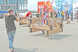 Третьим упражнением была «Богатырская эстафета», которая включает четыре этапа: перенос «коромысла» весом 410 кг, «колодца» – 340 кг, цепи – 200 кг, для всех на расстояние 25 м, и завершало эстафету «бревно» весом 180 кг, которое нужно поднять одному атлету.