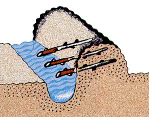 Укладываю черенки горизонтально на грядку на расстоянии 8-10 см один от другого (при меньшем расстоянии они растут хуже), чтобы один или два глазка висели над канавкой. Черенки закрываю плодородной землей слоем 15 см. В канаву ежедневно заливаю воду с таким расчетом, чтобы влага проникала под черенки - так лучше идет окоренение. Приживаемость черенков до 90%, и она повышается, если нижние концы 18-20 ч подержать в растворе Гетероауксина (одна таблетка на 1 л воды).
