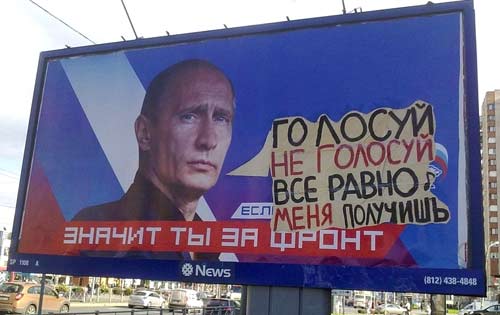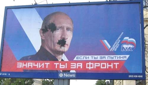 У Путина теперь другая игрушка: Общероссийский гражданский фронт. Многие города, говорят, ее плакатами завешаны. Если ты за Путина, то ты за фронт. В Москве этих плакатов практически нет, во Владивостоке – тоже. А в каком-нибудь Хабаровске – полно. И в Питере как родине президента. Вот питерские и издеваются над плакатами (а представьте, что могло бы быть во Владивостоке!).