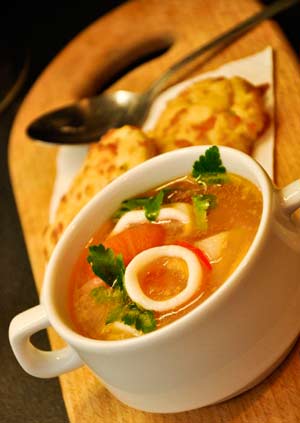 На100 г филе кальмара – 50 г риса,1,5 ст. л. консервированного зеленого горошка, половинка корня петрушки, 20 г слив. масла, луковица, соль, зелень. Лук и петрушку нарежьте соломкой и спассеруйте на масле. Подготовленные кальмары нарежьте соломкой. В кипящий бульон добавьте спассерованные овощи, через 10-15 минут – предварительно сваренный и промытый рис, кальмары, зеленый горошек и варите суп до готовности. При подаче посыпьте суп зеленью.