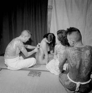 Японская мафия гордо ведет свое происхождение от обнищавших дворян-самураев, или ронинов, как называли их в Японии. Наследники многодетных отцов-дворян, не имевших подчас ничего, кроме меча, они унаследовали лишь право носить меч да еще причесываться по-самурайски: выбривать лоб и темя, длинные волосы с затылка заплетать в тугую косичку и наклеивать на синеватую кожу головы.