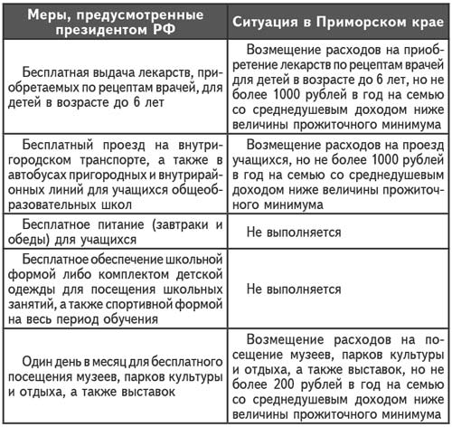 Президентом Российской Федерации установлен ряд мер по обеспечению жизнедеятельности российских многодетных семей. Однако наш приморский законодатель, вероятно, исходя из соображений экономии, существенно ограничил помощь многодетным семьям, проживающим на территории Приморского края, а в отдельных случаях произвольно освободил себя от исполнения социальных обязательств.