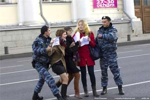 Сотрудники ОВД никак не могли понять, что же им со студентками делать: они ж ничего не нарушили. Один залез в Интернет и стал читать своим коллегам, что там пишут про это странное событие. В конце концов девушек отпустили, написав в рапортах, что провели воспитательную беседу, когда встреча вроде бы президента с вроде бы молодежью закончилась.