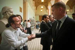Наконец появился Медведев и поднялся по лестнице в сопровождении ректора Садовничего, декана Вартановой и овации собравшихся на балюстраде студентов. Затем Медведев прошел в зал к отобранной аудитории, а ректора и декана не пустили. И верно: в зале же не студенты МГУ собрались, так что какое отношение к мероприятию имеют местные начальники?
