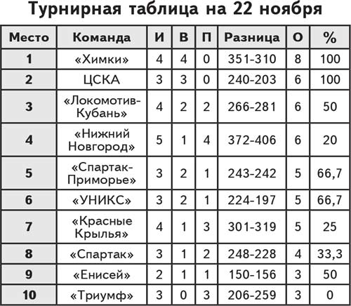 Выступление в играх чемпионата России приморцы продолжат 25 ноября встречей с «Химками» в подмосковных Химках. Результаты игр в ноябре: «Красные Крылья» – 68:72, «Нижний Новгород» – «Спартак-Приморье» – 88:89, «Локомотив-Кубань» – «УНИКС» – 48:62, «Химки» – «Спартак» «Санкт-Петербург» – 87:81, «Локомотив-Кубань» – «Спартак» «Санкт-Петербург» – 75:74, «Триумф» – «Химки» – 72:93.
