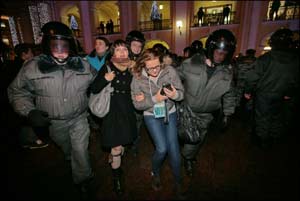 У Гостиного двора задержаны около 100 человек. Акция «уличной» оппозиции вечером 5 декабря оказалась более «зажигательной» и многочисленной, чем аналогичная попытка выразить протест против выборов 4 декабря. Число задержанных возросло.