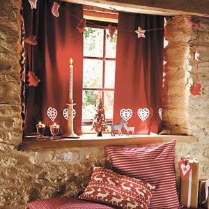 Набросаем на диван подушек в вишневых чехлах, оформленных скандинавскими мотивами – оленем, вышитым узором, с вручную обметанными краями. Разнообразим новогоднее украшение интерьера ленточками, шариками и сердечками на ёлке, оформим бантиками зеленую гирлянду на каминной полке. Чтобы новогоднее оформление интерьера смотрелось еще более эффектно, можно заранее заказать ночные шторы из ягодного фетра, а подоконник украсить тематически – красная декоративная елочка, свечки белые и красные в подсвечниках разной вышины. Верхнюю часть окна можно также украсить гирляндой, пошитой своими руками. Сшейте мягкие игрушки – миниатюрные сердца, елочки, шарики, носки. Пришейте их к длинной атласной ленте и сотворите с помощью простейшей самодельной гирлянды настоящий новогодний дизайн интерьера.