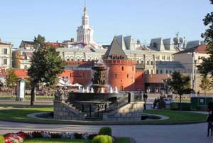 Вдали виднеется церковь на Псковской горе с прилегающей к ней видовой площадкой. Чуть-чуть поодаль – храм Василия Блаженного, получивший мировую известность и ставший символом России. Этот храм, построенный по указу Ивана Грозного, напоминает роскошный яркий цветок.