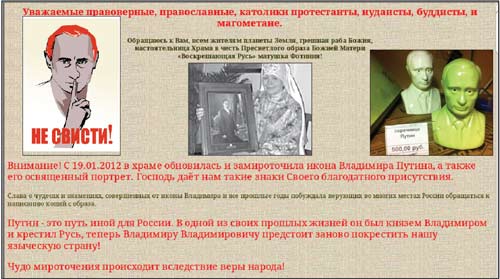 Нет, это не ошибка и не опечатка. Есть такие поклонники кандидата Путина, которые на него молятся в самом прямом смысле. Иконой даже разжились. Они вообще-то православные, но какого-то буддийского извода: признают переселение душ и считают, что в одной из прежних жизней Владимир Путин был Владимиром, который крестил Русь.