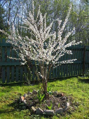 Для сооружения гребня копаю траншею глубиной около двух штыков лопаты и заполняю ее битым кирпичом и специально нарубленными обрезками жердей, лучше ольховых, вперемешку с землей. Засыпаю всё это сперва ветками деревьев с листьями (лучше ольхи, так как она быстрее сгнивает во влажной среде), а сверху забрасываю обычной землей –суглинком так, чтобы после оседания с середины лета к осени высота гребня достигла примерно метра и ширина порядка метра. Частично пользуюсь землей, выброшенной при копке траншеи. В середине гребня делаю лунки глубиной полметра и заполняю их плодородной почвой. Посадку произвожу весной (как все косточковые) специально для этого выращенными из семян сеянцами. Более десяти лет на одном месте кусты не держу. Каждую весну до распускания почек кусты прореживаю, а когда листья начинают развертываться, удаляю подсохшие веточки и верхушки подмерзших побегов.