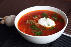 Бульон или вода капусту – 1,5-2 л, свекла – 3-4 шт., капуста – 250 г, морковь, 1 корень петрушки, 1 луковица, мука – 1 ст. л, сало или жир, сахар и уксус по вкусу. Свеклу нарезать соломкой, сбрызнуть уксусом, прогреть с добавлением жира. После этого подлить немного бульона и тушить до мягкости. Лук поджарить с жиром, добавить морковь и пассеровать вместе. В кипящий бульон положить нашинкованную капусту, варить 15 мин., добавить тушеную свеклу, обжаренные коренья и лук, пряности, разведенную мучную заправку и варить до готовности. Перед окончанием варки добавить свекольный настой и рубленый со свиным салом чеснок.