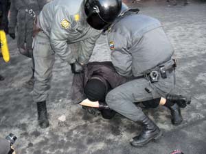Сотрудники полиции вначале согнали всех с моста и приступили к массовым задержаниям. Людей брали в кольцо и под крики «ПОЗОР!» отводили в автобусы. В это время в полицейский автобус кинули «коктейль Молотова», полицейские быстро его потушили.