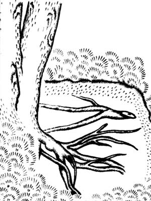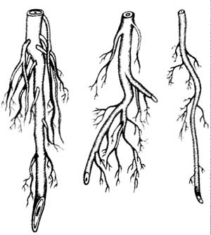А размножить такие растения можно корневыми черенками. Для этого поздней осенью или рано весной у корнесобственных деревьев осторожно откапываю боковой корень (см. рис. ниже) и беру от него несколько отрезков длиной 0,5-0,7 м. При заготовке осенью храню их в траншее, выкопанной на участке. Отрезки связываю в пучки и устанавливаю на дно траншеи вертикально, вверх теми концами, которые дальше от корневой шейки. Сверху пучки пересыпаю песком, затем землей. Весенние отрезки сразу идут в работу.