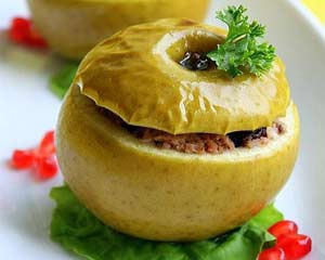 6 яблок, 150 г творога, 100 г изюма, 40 г слив. масла, 50 г сахара, 20 г манной крупы, 5 желтков. Срежьте с яблок верхушку, удалите сердцевину и часть мякоти. Мякоть мелко нарежьте, творог протрите через сито или пропустите через мясорубку. Изюм вымойте и обсушите. Творог хорошенько перемешайте с мякотью яблок, изюмом, сахаром, манной крупой, желтками и растопленным сливочным маслом. Яблоки нафаршируйте творожной массой, выложите на противень и запеките в духовке.