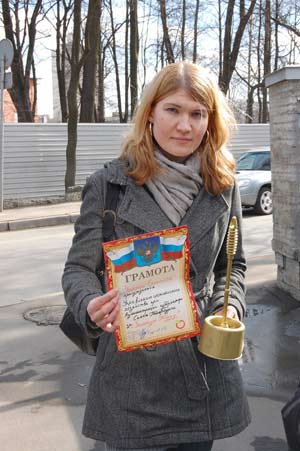 В четверг, 5 апреля, оргкомитет отправился лично вручать премию лауреату. Здание, в котором находится городское Управлению гостиничного хозяйства, расположенное в элитном месте, окружено высоким железным забором, глухая калитка оборудована домофоном. Чиновники отказались пустить делегатов с их премией на территорию. Правда, и не прогнали, попросили подождать. Чуть позже стало понятно, почему. Через пару минут к воротам подъехала полиция. И только под ее «защитой» чиновница Управления решилась приоткрыть дверь калитки, чтобы забрать выкрашенный золотой краской туалетный ёршик и грамоту.