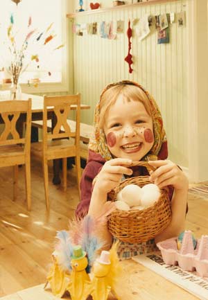 Весенний праздник всегда отражает красоту весны и щедрость природы. Потому смело используйте дома весеннюю тему. Пусть основным цветом станет желтый: выберите салфетки и скатерти в желтых, соломенных, лимонных оттенках. Именно эти тона солнечны, а гармонировать с ними может голубой весенний цвет неба. Долой синтетику! Постарайтесь использовать натуральные материалы: льняные скатерти или хлопковое кружево, оно может украсить корзиночку, где лежит хлеб. Для такого стола подойдет глиняная посуда, плетёные подставки для хлеба и салфеток. Даже пасхальные яйца могут быть плетеными. И первоцветы будут гармонично смотреться на вашем весеннем столе – гиацинты в горшочках, лесные подснежники, нарциссы… Даже если сейчас посадить в тарелку или мисочку с землей овёс, то зеленые стебли успеют показаться к праздничному столу – в них прекрасно смотрятся крашеные яйца. Кстати, крашение яиц – это совсем не христианский обычай. На Земле он живёт тысячелетия. Ещё наши далёкие предки красным цветом яиц отмечали приход красного солнышка – солнцеворота, весны… И только гораздо позже этот обычай пришёл и в христианскую религию. А ещё для пасхального стола важен символ плодородия – пасхальный заяц. Так что привычные магазинные шоколадные зайчики оттуда, с пасхального стола. Они просто разбежались по разным странам…