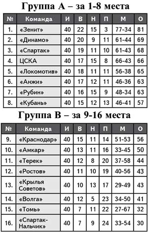 Очередной тур чемпионата страны принес следующие результаты: «Локомотив» – «Рубин» – 0:0, «Крылья Советов» – «Ростов» – 2:1, «Спартак» (М) – «Анжи» – 0:3, «Терек» – «Краснодар» –0:1, «Кубань» – «Зенит» – 2:2, «Динамо» – ЦСКА – 1:0, «Волга» – «Томь» – 2:0, «Амкар» – «Спартак» (Нч) 1:0. Очевидно, что санкт-питербургский «Зенит» никто догнать не сможет (см. турнирную таблицу).