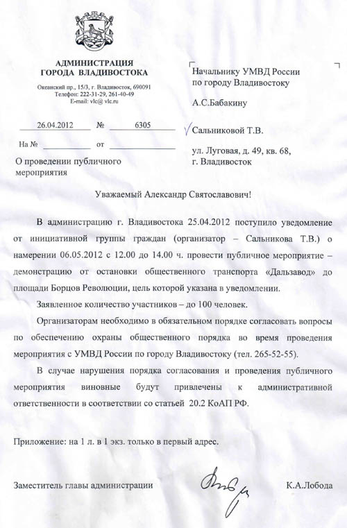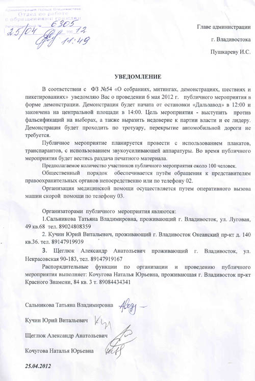 Акция во Владивостоке согласована, уведомление прикладывается.