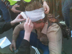 Омоновец ударил шлемом по голове. Крови нет, но башка немного кружится. Мама, не переживай; я в порядке.