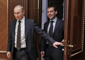 А на следующей после Медведева день в Думе блистал президент избранный, дохаживающий последние часы в премьерском ранге. Говорил все больше об успехах на ниве борьбы с мировым кризисом и амбициозных планах. И вот уже снова будущий премьер Медведев на трибуне — на заседании Госсовета.
