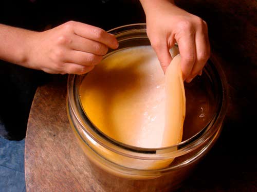 Затем процедите при помощи марлевой ткани, ополосните банку и снова перелете настой в банку. Накройте банку марлевой тканью, предварительно сложенной в несколько слоев и поставьте в теплое темное место. Далее процесс будет развиваться по стандартной схеме – примерно через две недели появится сильный уксусный запах, который вскоре исчезнет. А сам гриб образуется через полтора-два месяца.