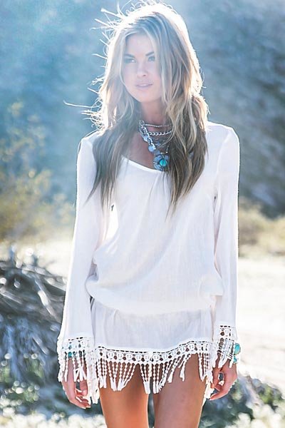 Во-вторых, не нужно выбирать белую пляжную одежду из тонкой ткани, так как они обладают самой низкой степенью защиты, если не сказать, что нулевой. Этот факт в большей степени относится к таким вещам из хлопка, если климат места для отдыха и ношения данных вещей очень влажный, поскольку мокрый хлопок совершенно не защищает от вредоносного излучения. В этом же случае шифоновая белая туника имеет место быть, ведь шелк и вискоза при намокании становится плотней. Стоит добавить, что защитные свойства шелк приобретает лишь в мокром виде, в сухом же, его показатель защиты равен нулю, поэтому в отпуске стоит отказаться от использования одежды из натурального шелка.