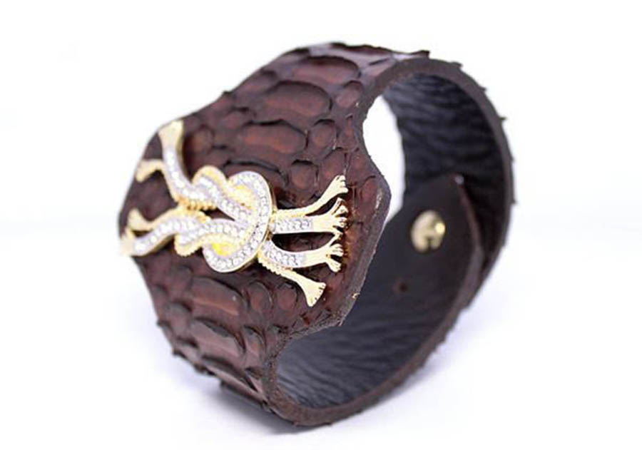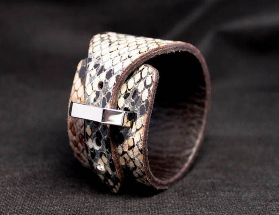 Кожа - профессия дизайнеров нашей студии-мастерской. Она - податливый и мягкий материал и неиссякаемый родник для вдохновения и творческой фантазии дизайнеров. По коже можно выжигать целые миниатюры, рисовать красками цветы, делать тиснение причудливых орнаментов и логотипов. Кожу можно инкрустировать стразами, полудрагоценными камнями или разнообразной металлической фурнитурой. Для изготовления браслета нет лучшего материала, чем качественная кожа, особенно для мастера, владеющего технологиями обработки и бычьей кожи, и кожи экзотических животных для придания ей нужной формы.