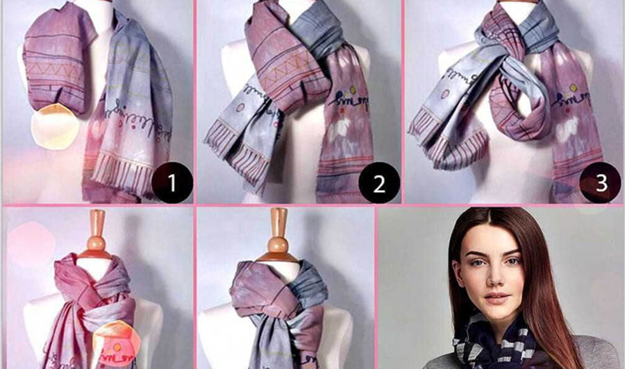Способов огромное количество. Обычный шарф можно завязать узлом, бантом, уголком и в виде косички. Из него можно сделать обычный хомут, обернув его вокруг шеи, а небольшой длины можно просто сложить вдвое и продеть оба конца в образовавшуюся петлю. Так обычно делают девочки-подростки. Шарф, обернут несколькими слоями поверх пальто, дизайнеры считают самым оригинальным и практичным в холодное время года. Создается эффект небрежности и рафинированности.