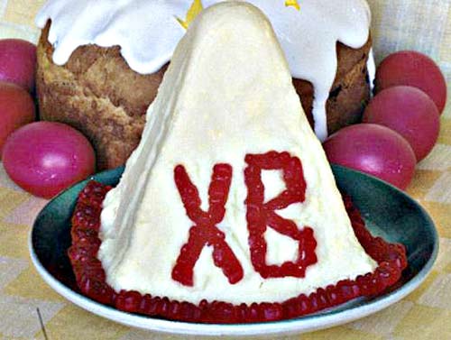 Ряженку соедините с молоком и сметаной, добавьте растертые с сахаром желтки, доведите до кипения при постоянном помешивании. Несколько минут кипятите, пока не отойдет сыворотка. Охладите. Подвесьте в марле часа на два, чтобы сыворотка стекла. Массу протрите через сито, добавьте растертое с сахаром сливочное масло, ваниль и хорошо перемешайте, затем выложите всю массу в пасочницу, глубокую миску и т.п. блюдо.