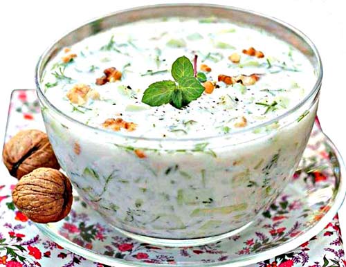 1) 2 огурца, 400 мл кефира или кислого молока, соль, перец – по вкусу, пучок укропа, 2 зубчика чеснока, 5-6 грецких орехов.