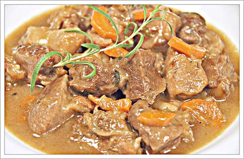 Мясо посолите и поперчите. в огнеупорной кастрюле разогрейте раст. масло и поджарьте кусочки мяса 8-10 минут и выложите его на тарелку. В эту же кастрюлю положите лук, посолите, жарьте минут 10, затем добавьте сахар и помешайте. Положите туда мясо, залейте бульоном и пивом, добавьте тимьян и лаврушку, уменьшите огонь, накройте крышкой и тушите полтора часа, пока мясо не станет нежным. Добавьте морковь и картофель. Тушите до готовности. Это мясо хорошо морозить, сначала быстро остудив, оно может храниться достаточно долго. А перед употреблением разогрейте на небольшом огне, добавив смесь с кукурузной мукой, проварив ее 2-3 минуты.