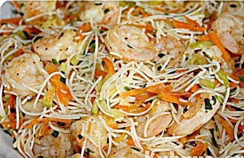 На 450г сырых креветок — крупная луковица, мелко порубленная, 2 тонко нарезанных красных сладких перца, 350г картофеля, нарезанного кубиками, 350 г мороженой сладкой кукурузы (можно заменить консервированной), 150 мл нежирных сливок, 425 мл молока, 2 ст. л. олив. масла, 1 лавровый лист, по половинке чайной ложки душицы или майорана и молотого мускатного ореха.