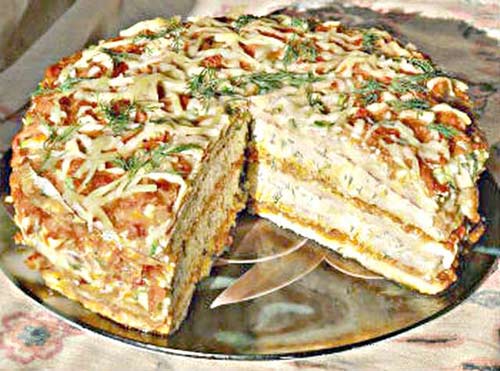 Натрите кабачки или цукини на крупной тёрке (молоденькие можно не чистить), посолите и дайте постоять, чтобы выделился сок. Сок весь слейте, если нужно, даже отожмите. Теперь можно добавить муку, яйца, соль и гашеную соду, хорошо перемешайте, ещё немного поперчите и посолите. Выкладывайте кабачковую массу ложкой на сковородку с небольшим количеством раст. масла, разровняйте всё по поверхности сковороды. Обжарьте лепёшки с двух сторон на среднем огне, переворачиваются они очень легко. Получается обычно 4 лепешки. В майонез выдавите чеснок, перемешайте. Смажьте четвертью майонеза одну лепешку, уложите тонкие дольки помидоров, посыпьте нарезанным укропом и накройте второй лепешкой. На неё положите треть майонеза и посыпьте тёртым сыром. То же самое проделайте с двумя другими лепешками: одна – с помидорами, верхняя – с сыром. Украсьте верх натертым крутым яйцом. Пусть этот слоёный тортик настоится в прохладном месте, тогда он станет ещё вкуснее.