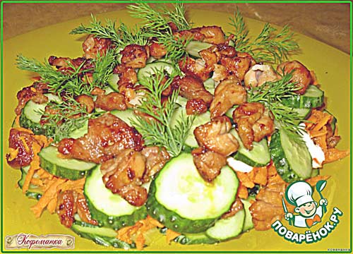 300 г куриного филе сварить и нарезать соломкой, 200 г сыра натрите на терке, а свежий огурчик нарежьте маленькими кубиками. Салат выложите слоями: 1 — сыр, 2 – куриное филе, 3 – сыр, 4 – курочка, 5 – огурец, 6 – морковь по-корейски. Каждый слой промажьте майонезом. Салат не перемешивайте до подачи на стол, тогда и можно перемешать.
